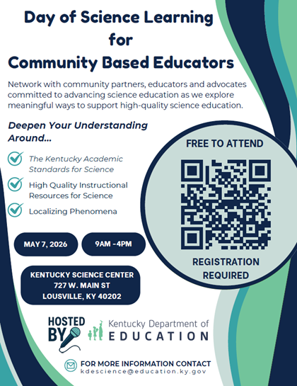 Are you an individual or part of an organization outside the formal school system that provides meaningful science learning experiences connected to real-world applications? As Kentucky advances the United We Learn vision, we know vibrant learning happens when schools and communities work together. Community organizations, informal educators and industry partners play a critical role in helping students connect science to authentic, local experiences. Join us for the Second Annual Day of Science Learning for Community Based Educators hosted by the Kentucky Department of Education. This dynamic networking experience centers collaboration, shared responsibility and high-quality science education in service of Kentucky students. Together, we will explore how strong community partnerships provide vibrant, relevant learning experiences that connect classroom instruction to the local context.